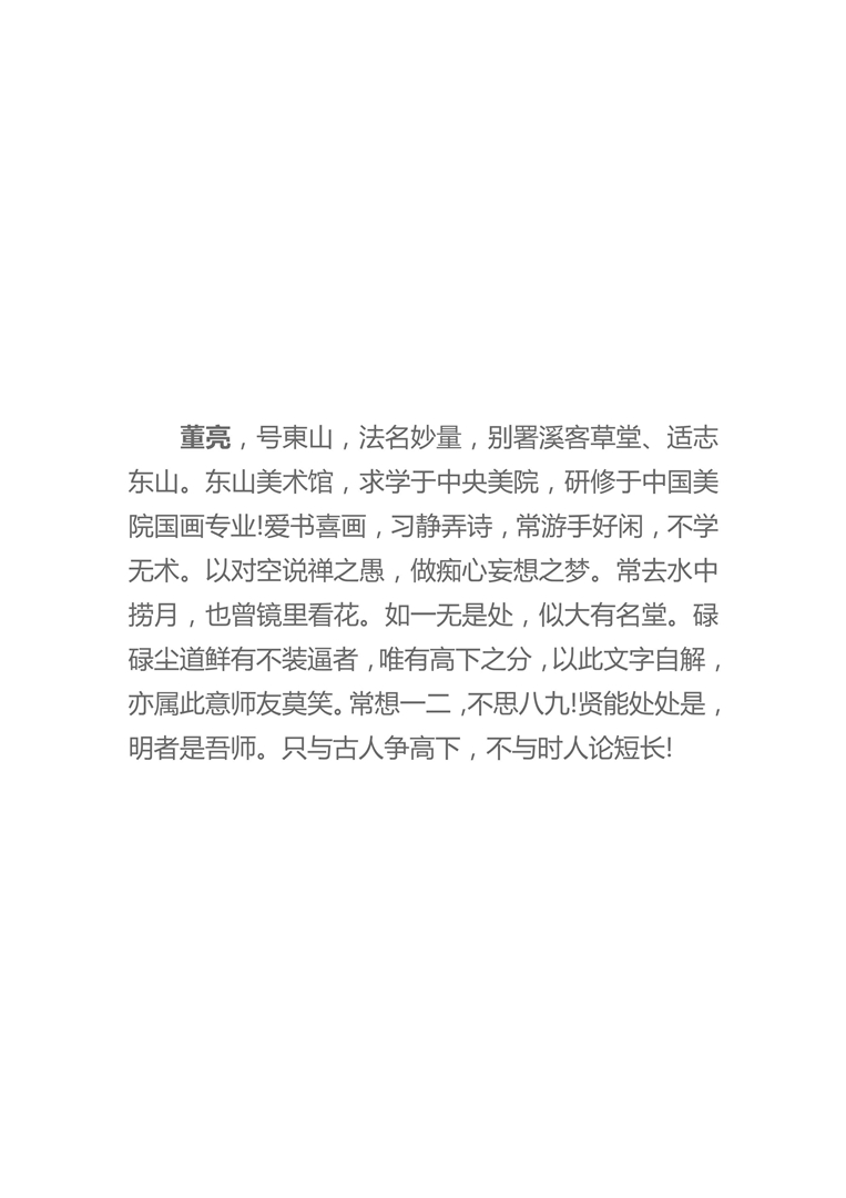 董亮,号東山,法名妙量,别署溪客草堂、适志东山。东山美术馆,求学于中央美院,研修于中国美院国画专业!爱书喜画,习静弄诗,常游手好闲,不学无术。以对空说禅之愚,做痴心妄想之梦。常去水中捞月,也曾镜里看花。如一无是处,似大有名堂。碌碌尘道鲜有不装逼者,唯有高下之分,以此文字自解,亦属此意师友莫笑。常想一二,不思八九!贤能处处是,明者是吾师。只与古人争高下,不与时人论短长!